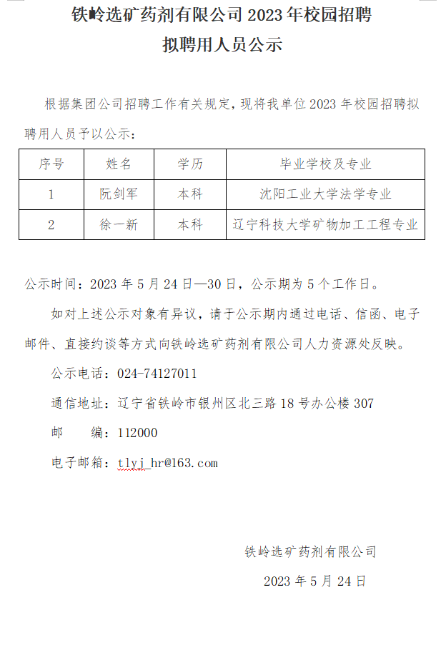 鐵嶺選礦藥劑有限公司2023年校園招聘 擬聘用人員公示